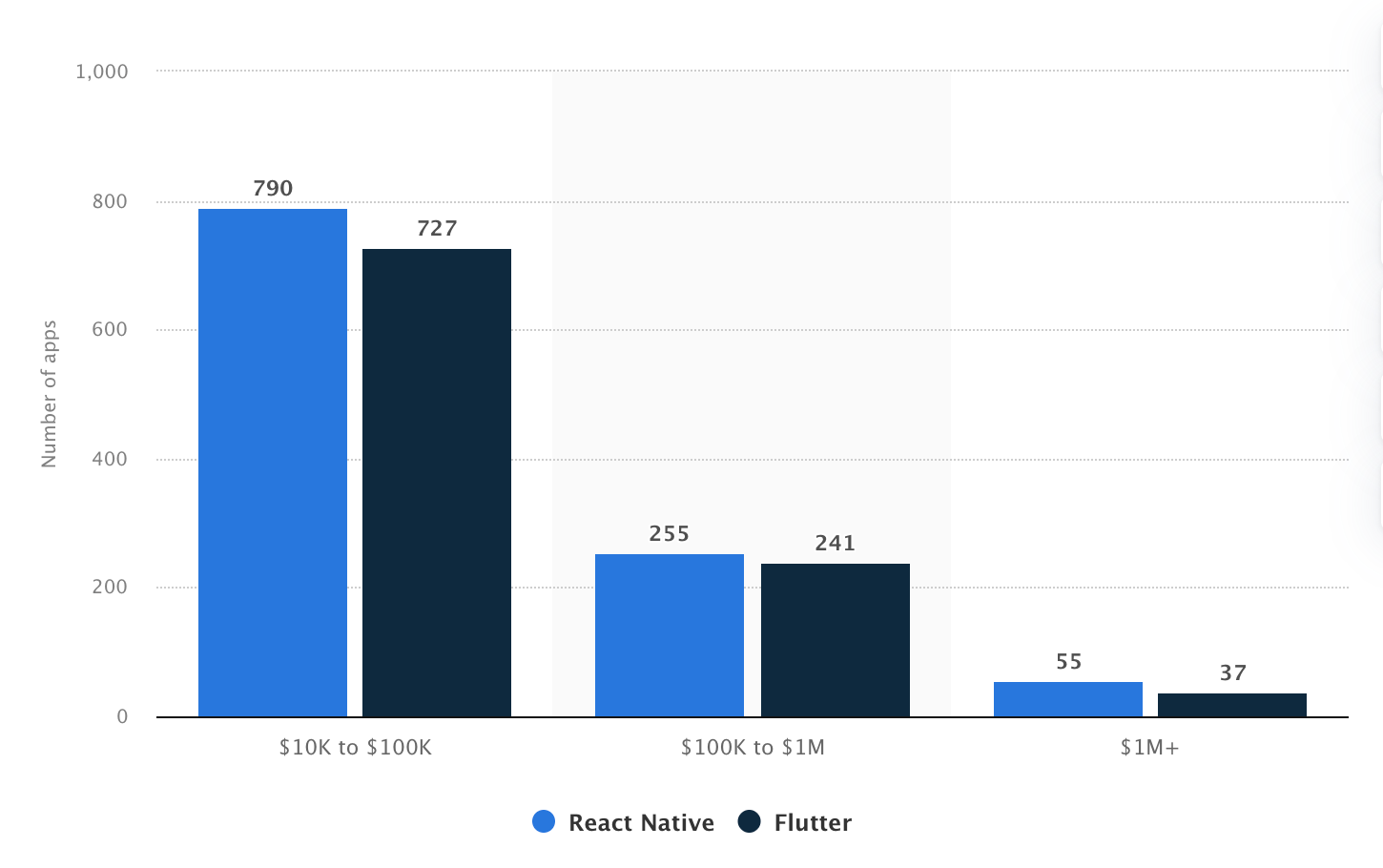 According to Statista, 790 apps built with React Native generate between $10,000 and $100,000 in monthly revenue, compared to 727 Flutter apps in the same revenue range. The gap is small, but it highlights an important point: both frameworks are already powering products development with proven commercial traction.